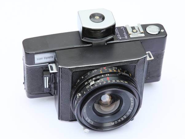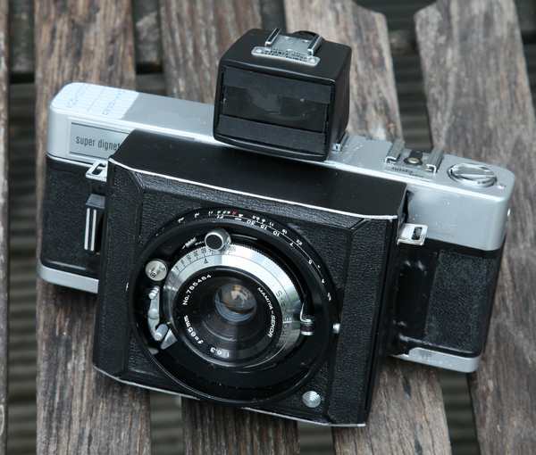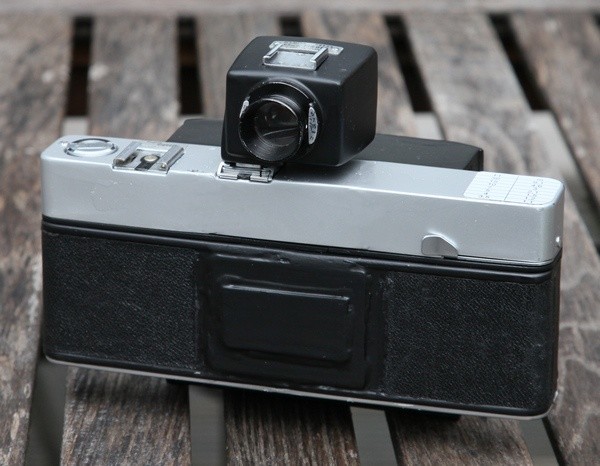 The rear part of the camera consists of three bodies taken from Dacora Dignette 35mm cameras, from the late sixties. Those cameras are well suited because of their simple construction and their aluminium body, that is easy to work with. Here are the three rear parts, glued together: