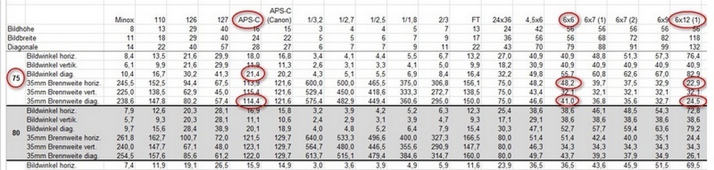 Focal Length Whoever deals with different film or sensor formats, will probably align his expectations, which angle of view a particular focal length will yield, to "equivalent 35mm focal lengths", at least I do. I however know that not everybody does, my father always thought of a 50mm lens as a wide-angle, since he was thinking in (Rollei) 6x6 terms. To compare different focal lengths on different formats, the diagonal angle of view is usually looked at. This sufficient, as long as the aspect ratio of the formats is about equal. But even if 35mm and 6x6 are compared, this shows its weakness - a 75mm focal length is (if the diagonal angle of view is considered) equivalent to a 40mm lens on 35mm. But horizontally the 75mm does not reach the angle of view of the 40mm - and vertically it exceeds it. And if panorama formats come into play, this becomes a useless comparison. So, if aspect ratios differ, it makes sense to either compare horizontal or vertical angel of view, but not diagonal! This is not rocket science, and there are even "Tools" on the internet. I however use a table, that might also be of use to others (sorry for the German descriptions).