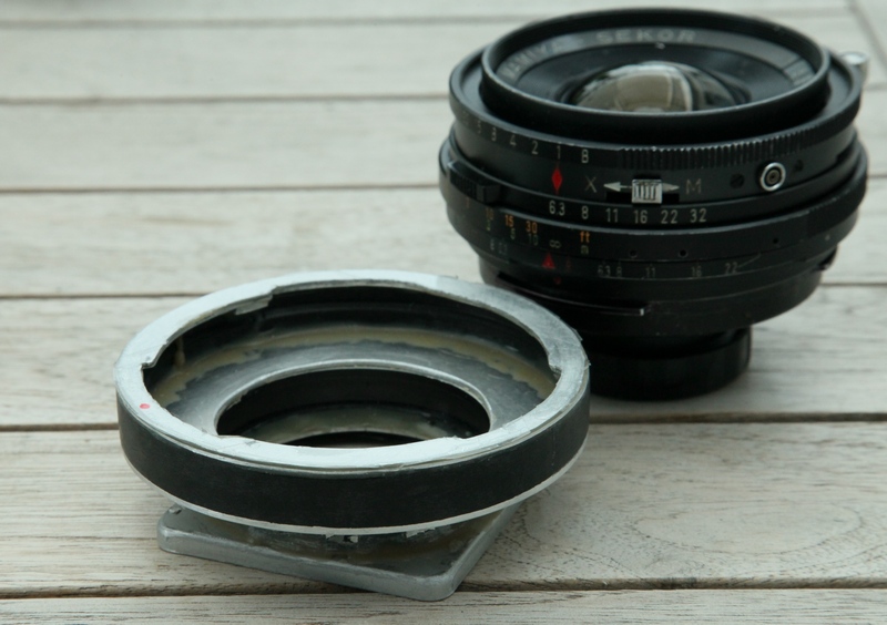 Centrury Graphic. To mount the lens nonetheless, I had to make an adapter that puts the lens in front of the lens board, the lens board itself is so small, the hole for the rear element of the lens leaves just enough material. Anyway, some measuring revealed that it is indeed possible... For the adapter I used aluminium sheet metal and some leftovers from previous projects. This is how the adapter looks: And with the lens fitted to the camera: Obviously, the lens is "over the top"... Even if there is no need for absolute parallelism between film and lens plane on such an outdoor camera, it still has to feel right - and it doesn't. So the search for the perfect wide angle camera continues... |
