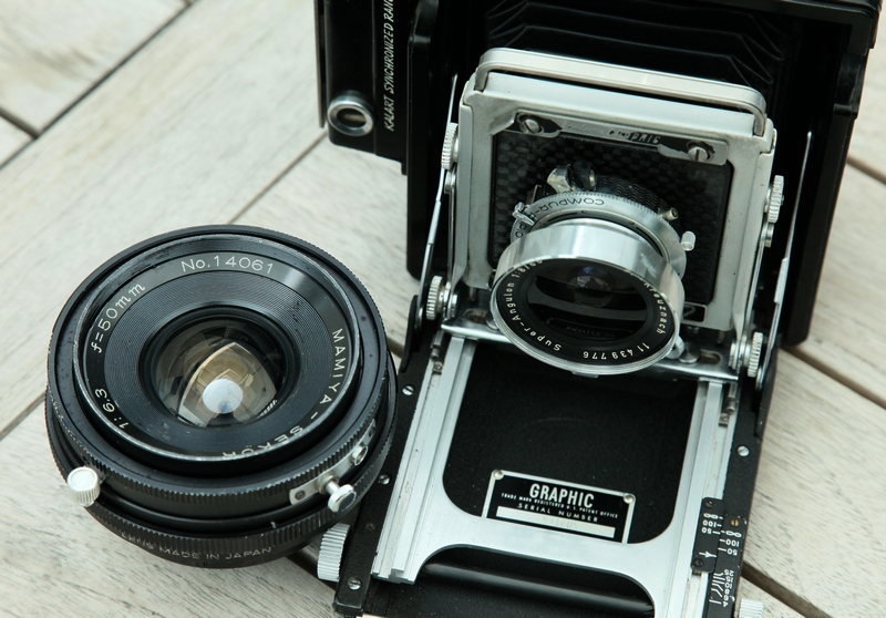 adapted to Graflex Century Graphic 2x3" (2013) Among other things, I am on my way to the perfect wide angle camera and, to be clear, it is not this one. But the Graflex Century Graphic indeed is a small and light option to be outdoors with a 6x9 roll film camera and make use of some camera movements. One nice combination is to use it with large format lenses, e.g. with a Schneider 65mm Super Angulon, yielding an angle of view equivalent to that of a 29mm lens on 35mm. And, since the Angulon image circle is big, some movements are possible. Another combination is that with lenses of even shorter focal lengths - without movements, because behind those lenses, the lens board sits inside of the camera body when focused to infinity. This may still be of interest, as 50mm on 6x9 equals 20mm on 35mm and, well, I happen to have the lens (and I like it a lot). Those who own a 47mm Angulon may choose to read something else from here onwards... Unfortunately, the 50mm
