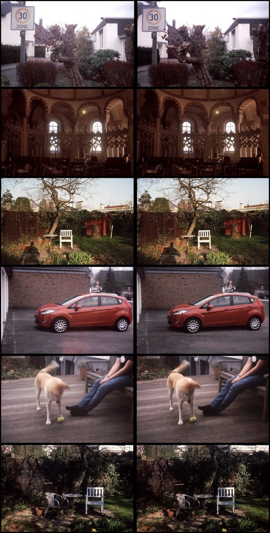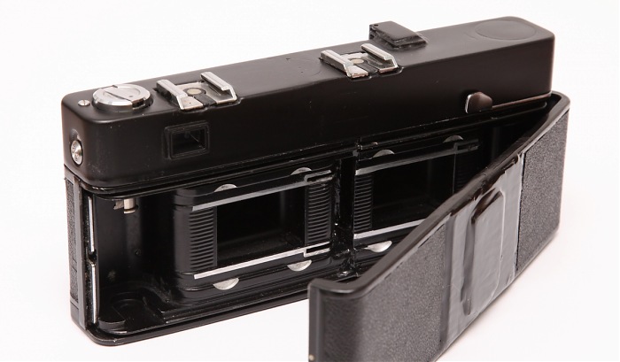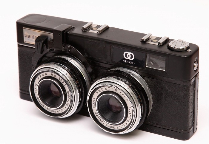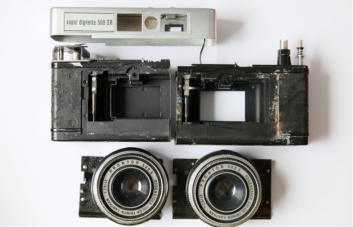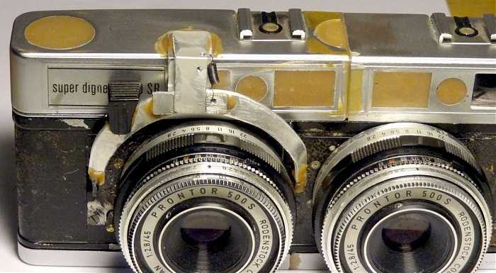 35mm Cameras (2012) Also, there is no way around admitting that the resulting stereo base (the lens to lens distance) is pretty wide, even when using these miniature cameras. With regard to the "ideal" stereo base, there are three concepts, as far as 35mm film is concerned. All three concepts have disadvantages (following the classic motto "Cost, Quality, Time - pick two" 1) The full 24x36 format can be used together with the ideal 65mm stereo base - at the cost of lots of unused film 2) The full 24x36 format can be used at full film utillisation - but the stereo base will be bigger than ideal. 3) Or, using the ideal stereo base, the film can be used up entirely, with a smaller image format Comercially available stereo cameras usually have smaller image formats (24x22, 24x30). For option 2 there are DIY solutions (using e.g. Rollei 35 cameras). Option 1) cameras have been available from the German company RBT. Such a camera I wanted to make myself, again from two Dacora Dignette cameras, well suited because of their simple construction and their fine Rodenstock lenses. The following picture shows camera parts after disassembly and "cutting". ![]() I set out to try and keep most of the camera functions - the Dignette sports a true range finder and a coupled meter, with needle display in the viewfinder. Also, I certainly aimed for a common shutter cocking operation and a common shutter release. Unfortunately, much went wrong during disassembly and assembly, so that I would have had to start again with two new cameras, in order to keep range finder and meter functions (the whole stuff spent months in a dark corner...). Meanwhile, I have dug out the bits and pieces and have tried to bring this ill-fated project to an end, by deleting both range finder and meter function, but at least with common shutter cocking and a common (though not very elegant) shutter release. This is how the camera looked before painting: