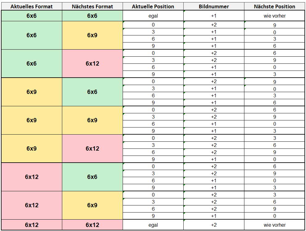 notwendigen Abstände zwischen 6x6, 6x9 und 6x12 sind auf der